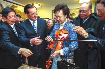 昨天上午,当地小提琴家特地演奏了一首“阿里山的姑娘”,欢迎连战一行。连战夫妇观看了来自平谷东高村镇提琴基地的获奖小提琴,连战夫妇现场试拉了小提琴,连战还尝试了小提琴制作的打磨技艺。随后,连战向小提琴制作师常忠秋赠送礼物。