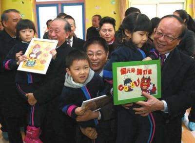 昨天,随连战一同到京的郁慕明(左三)、蒋孝严(右一)来到北京安慧里社区参观访问,与台商投资的社区幼儿园的小朋友亲切互动。