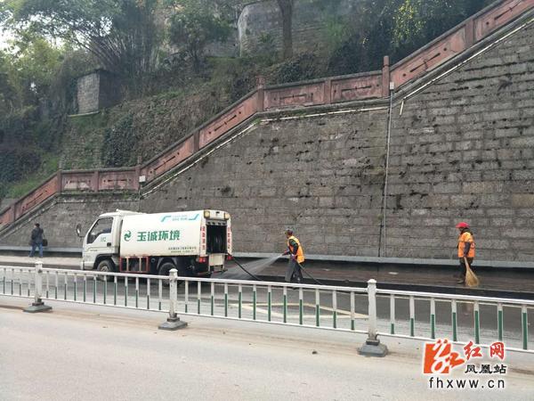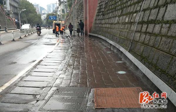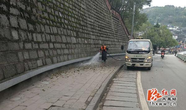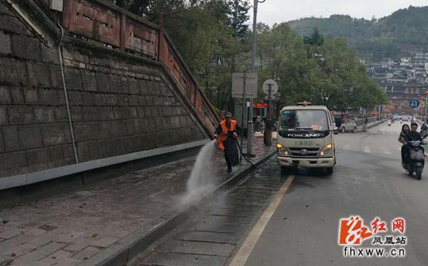 红网凤凰县分站3月16日讯(通讯员 莫有兵) 3月14日,笔者从凤凰县沱江镇南华路看到,环卫工人正在清洗街道,清洗过后的街道油亮可鉴,赢得行人和游客啧啧称赞。