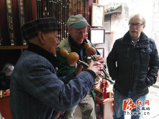 两天行程中,考察团一行随导游先后参观了沈从文故居、熊希龄故居等县内知名人文景点,观看了大型实景演出剧《边城》,并体验了姜糖制作、葫芦丝吹奏等具有凤凰特色的民间工艺技巧。