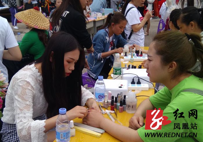 专业展示分6个展区,各专业根据各自特色进行现场绘画、手工制作、茶艺展示等,吸引了众多社会人士围观。在免费体验区,形象专业组学生为大批爱美人士提供了化妆、美甲、剪发等优质服务。现场还设有办学特色展板宣传,中职招生咨询台,向群众发放宣传册。