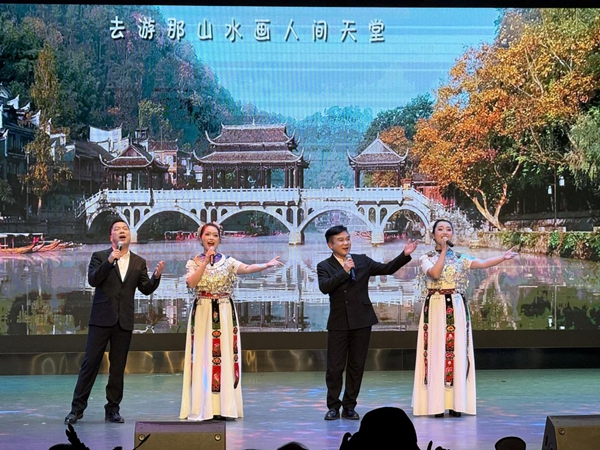 “来来来来我们去凤凰,去走那古城穿越小巷......”歌曲《去凤凰》的歌词生动勾勒出凤凰古城的独特景致与人文魅力,并融合了湘西阳戏音乐元素与现代流行曲风,节奏明快、感染力强。为呈现最佳演出效果,凤凰县文化馆组织专业骨干对参演演员进行悉心指导,从发声技巧、和声编排到舞台表现、服装道具,每一个细节都反复打磨。演出当天,四位演唱者以饱满的精神状态、默契的和声配合登台,歌声时而悠扬婉转如沱江流水,时而热情奔放似湘西欢歌,将对家乡的热爱与对远方来客的邀约融入每一个音符,让现场观众仿佛身临其境,领略到“山水画廊、人间天堂”的凤凰之美。
