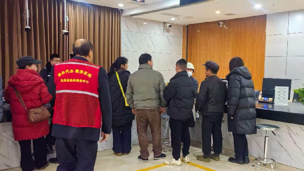 办事高峰时段,身穿统一标识服装的帮代办人员化身“秩序守护者”,在大厅内有序疏导人流、维护现场秩序。他们主动引导群众通过自助终端、线上平台办理业务,缓解窗口压力,针对突发情况及时介入协调,保障大厅运转井然有序。