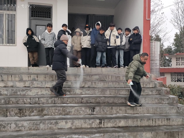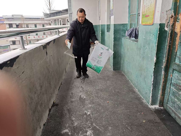 接到气象预警后,学校领导班子第一时间召开紧急会议,明确“安全第一、快速响应、分工协作”的行动原则,组建以党员教师为先锋、全体教职工参与的应急队伍,划分责任区域。清晨7时许,天未亮透,教职工们已手持铁锹、扫帚、融雪盐等工具集结到位,重点对教学楼出入口、食堂通道、宿舍门前等人员密集区域展开作业“撒盐——铲冰——扫冰——融雪”。经过1个多小时奋战,全面清除校园内积冰积雪,设置“小心地滑”警示标识,打通安全通道。同时,学校通过校园广播、班级微信群向师生及家长推送安全提示,普及防滑避险知识。