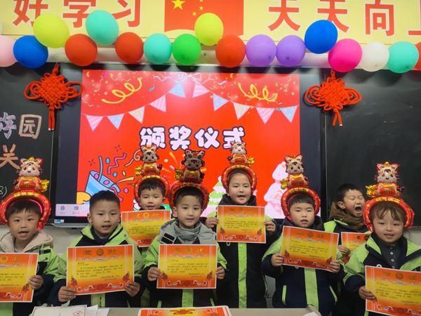 自由闯关环节结束后,学生们返回教室参加总结表彰。学校根据闯关卡上的标识数量,评选出“游园小能手”并颁发奖品,孩子们手持奖状和牛奶、棒棒糖等小奖品,喜悦之情溢于言表,本次游园活动在欢乐的氛围中圆满落幕。