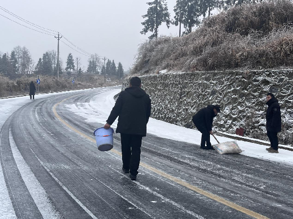 闻雪即行动,干群合力破冰保畅通。19日夜间起,值班干部与执法队员顶风冒雪,不间断巡查路面结冰情况,及时设置警示标志。20日清晨,各卡点人员提前到岗,引导行人、车辆安全通行。午后,大家再次出动,对结冰路段集中撒盐除冰,路过行人也纷纷参与,共同保障“银装素裹”美景背后的人民安全。寒风凛冽,村头路口志愿者的身影成为雪中最暖的色彩,一双双冻红的手,守护着万家灯火里的融融暖意。