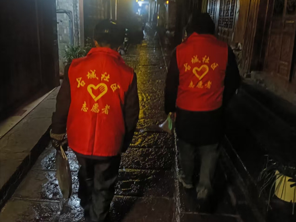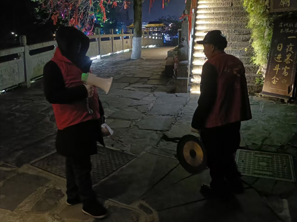 每晚11点左右,打更巡逻队深入古城核心街道、背街小巷、老旧小区等重点区域展开巡逻。队员们一边敲响警示铜锣,一边循环播报防火防盗、安全用电等温馨提示,让安全意识深入人心。同时,巡逻队还主动为晚归居民、滞留游客提供路线指引、应急帮扶等服务,用贴心的举动传递社区温暖。
