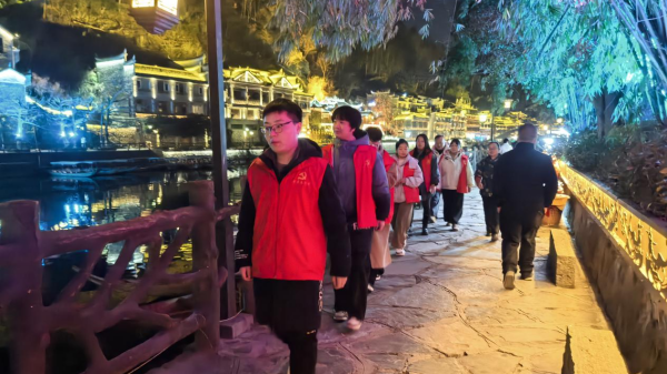 另一路巡逻队由旅游青年志愿者组成,重点巡查江边景区及周边区域。作为凤凰古城旅游的“活地图”,青年志愿者们不仅紧盯景区内的照明设施、消防器材是否完好可用,还主动为来往游客提供指引服务。他们帮迷路的游客规划游览路线,提醒带小孩的家长注意江边栈道安全,用青春活力为景区增添了一抹温暖底色。