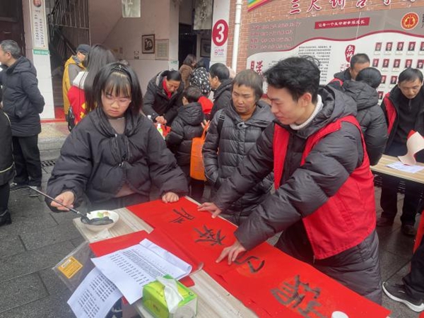 社区志愿者组织居民有序排队领取春联,挑选心仪的祝福语,还可以自己挥毫写出独树一帜的新年祝福,现场不时传来对书法作品的赞叹声。大家手持红彤彤的春联与软糯糍粑,合影留念,脸上洋溢着喜迎新春的幸福笑容。此次活动不仅让居民亲身体验了打糍粑、写春联的传统民俗,直观感受中华优秀传统文化的魅力,更以社校联动的形式,让传统文化在实践中传承、在互动中弘扬。