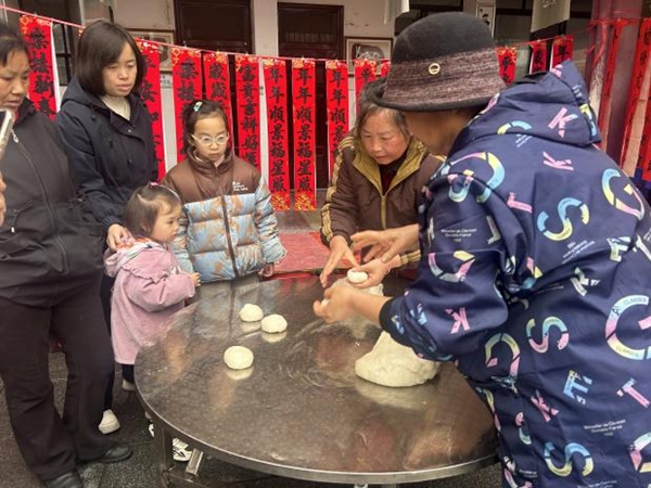 活动现场暖意融融,气象非凡。两大民俗活动区同步开展,传统年味与校园朝气相互交融。打糍粑区域内,现场支起蒸屉,雪白的糯米经旺火蒸制后,香气弥漫整个校园。志愿者将蒸制软糯的糯米盛入石臼,社区民俗能手示范抡槌捶打、翻拌成型等传统技法,前来参加活动的居民和师生在社区志愿者的引导下,轮流上手体验,你一槌、我一杵,石臼碰撞声伴着欢声笑语此起彼伏。软糯的糯米在反复捶打中变得筋道弹牙,大家亲手捏制出饱满、圆润的糍粑,捧着热气腾腾的成品,脸上满是收获的喜悦。社区将现场制作的糍粑分装打包,送给参与活动的师生志愿者和社区居民,让团圆香甜的年味传递到千家万户,以小小糍粑联结社校温情。糍粑黏住团圆,年味漫街过巷。