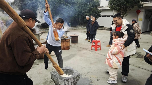 “快过年啦,和群众一起打糍粑,吃的才香!”三潭社区工作人员龙志勇举着木槌,奋力砸向石臼里的糍粑。