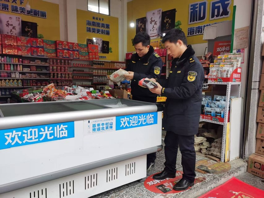 赶集,赶得是热闹,也赶那一口家乡味。卤肉、糕点、糖果、腊味……执法人员穿梭在摊位间,细看包装、细查票据、细问来源。在一处熟食摊前,炸串直接裸露摆放,没有防尘罩。执法人员没有急着说“罚”,而是轻声提醒:“过年灰重,苍蝇也爱往肉上落,摆成这样,买的人看了也不放心。”摊主一愣,赶紧翻出保鲜膜盖好,笑着说:“平时在家也这么摆,没注意,马上改。”“自家过年吃什么,就让乡亲们买什么。”摊主拍着胸脯说。