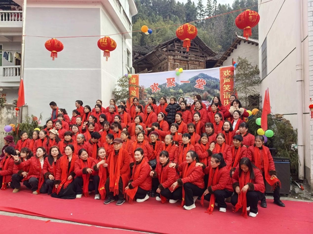 在唢呐声中,外嫁女们手持感恩牌,沿着古井、石桥缓步绕行,故乡的山水、熟悉的街巷,让大家重拾儿时记忆、共话乡愁岁月。10时活动正式开始,娘家人代表致辞欢迎,外嫁女代表莫娅楠深情发言,道出在外不忘故土、心系家乡发展的赤子之心,承诺将以实际行动支持娘家建设、为乡村振兴添砖加瓦。随后,歌舞节目轮番上演,莫群群演唱的《阿爸阿妈》真挚动人,将现场氛围推向高潮,掌声与欢笑声回荡在美丽乡村上空。