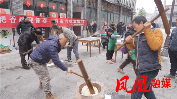 活动现场,套圈区人气爆棚,大人小孩排队上阵,瞄准、投掷,套中奖品的欢呼声此起彼伏,欢声笑语萦绕街头。另一边的打糍粑区域最是热闹。蒸熟的糯米入臼,居民们轮番挥槌,木槌起落间,糯米渐渐变得软糯黏香,热气裹着米香四散开来,大家边捶打边说笑,老手教新手,默契十足。