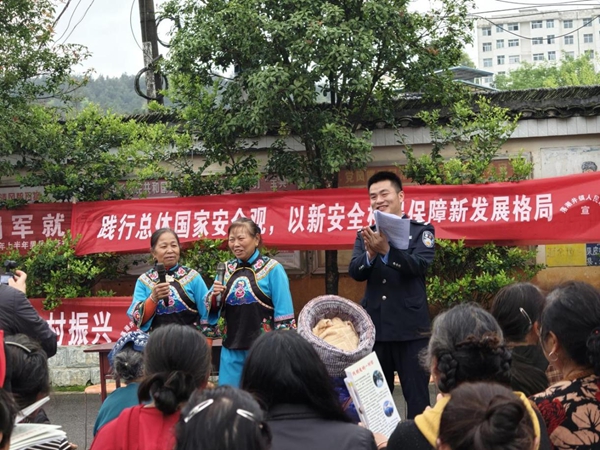 “苗家儿女心向党,幸福日子长又久……”活动现场,两名身着民族服饰的苗族大姐进行苗歌对唱,悠扬的曲调将国家安全知识娓娓道来。熟悉的乡音、朗朗上口的旋律,让台下的老人孩子也跟着轻声哼唱。司法员吴永吉随即接过话筒,用通俗易懂的方言讲解“什么是国家安全”“举报电话是多少”,并针对农村道路特点,反复叮咛骑乘摩托车佩戴头盔、不酒驾不超员。一时间,党的创新理论、法治观念与安全常识,在这片苗乡土地上深深扎根。