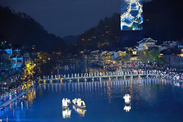 文化村以湘西民俗为主题,集演艺、非遗、休闲于一体。村内建筑延续吊脚楼风貌,每晚上演大型民俗实景演出,展现苗族传统风情与地方历史故事,晚间还有灯光水秀与互动表演,氛围热烈雅致。