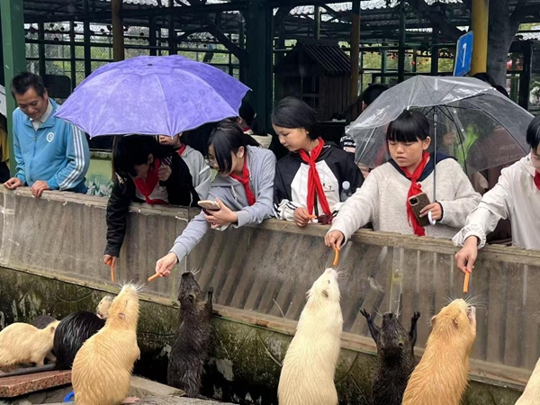 在熊猫园科普园区,同学们认真聆听熊猫知识讲解,系统了解国宝大熊猫的生活习性、生长特点与保护知识,近距离观赏熊猫的可爱模样,在生动有趣的自然课堂中感受生命魅力,树立关爱动物、保护自然的意识。随后,师生前往萌宠互动区域,孩子们有序投喂、温柔互动,欢声笑语在雨中不断回荡,雨水丝毫没有冲淡大家的愉悦心情。