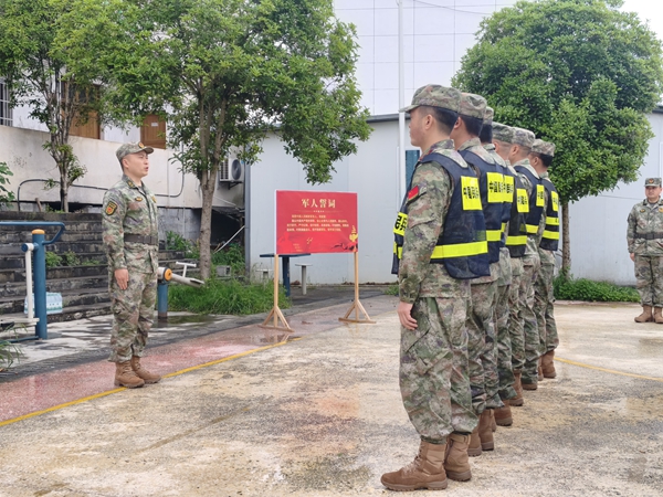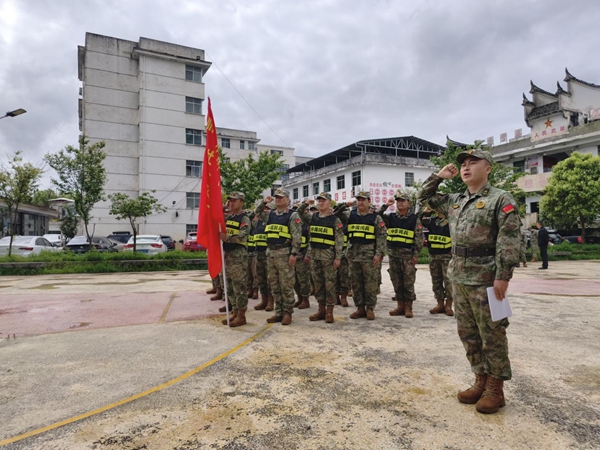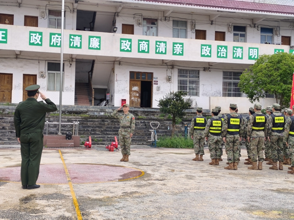 庄严宣誓环节,全体民兵高举右拳、神情肃穆,誓言如惊雷响彻苗岭。排长领誓,“我是中国民兵,我宣誓:服从中国共产党领导……”每一句誓言都铭刻在人心上,饱含着听党指挥、忠诚担当、守护平安、助力发展的坚定信念。新入队民兵代表向若尘发言,表示将以军人标准严格要求自己,汛期疏散群众、山火逆向冲锋、应急一线值守,在每一次应急救援任务中都要冲在前、干在先,绝不辜负民兵荣誉与人民期望。