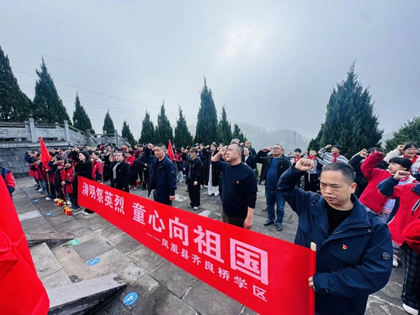 凤凰新闻网4月1日讯(通讯员 孙文城 龙书英 龙梅)“我们要铭记革命烈士功绩,传承红色基因、争做新时代优秀少先队员。”凤凰县齐良桥学区安同学说道。4月1日,薄雾朦胧,在清明节来临之际,为缅怀革命先烈、厚植爱国情怀,凤凰县齐良桥学区组织150名师生前往凤凰县烈士陵园开展“清明祭英烈,童心向祖国”主题祭扫活动。