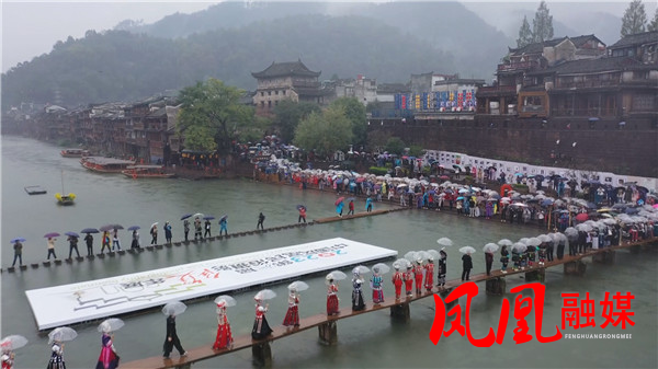当天上午,来自广西、贵州、湖南等地33支共1000多名苗族盛装代表队走进凤凰古城,沿着文化广场、雪桥、北门、跳岩等核心景点,巡游展示多姿多彩的苗族服饰银饰,成为古城里一道靓丽的风景线。