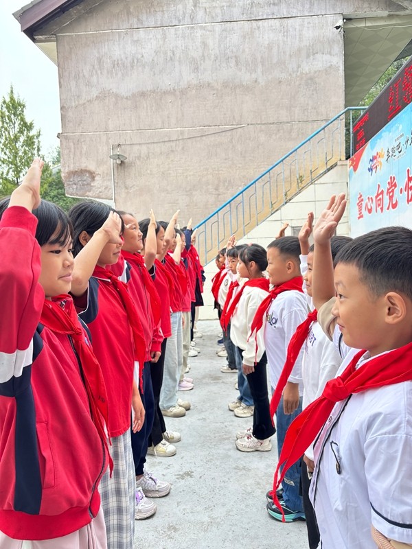 队歌毕,学区少先队总辅导员郑重宣布新队员名单,紧接着49名老队员为新队员系上红领巾并互敬队礼,红色领巾在胸前飘扬,成为仪式中最鲜明的“传承符号”。