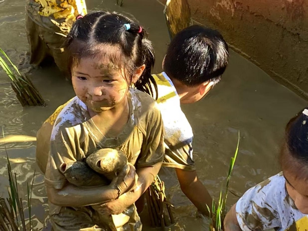 上午的阳光洒在金黄的稻田上,孩子们牵着家长志愿者的手,蹦蹦跳跳地走向田间,“娃娃们,这稻穗一低头,就是田里的鱼儿最肥嫩的时候啦,”当孩子们听说鱼儿是“吃稻花、喝山泉”长大时,一双双眼睛顿时闪闪发光,稚嫩的脸上写满了对稻花鱼的好奇与向往。随着老师一声“活动开始”,稻田瞬间变成了欢乐的海洋,有的小朋友盯上了一条肥嘟嘟的稻花鱼,像小老虎般猛扑过去,鱼儿却'嗖'地滑出指缝,他一屁股坐进泥水,成了个 “小泥人”,逗得周围的家长和老师哭笑不得,家长志愿者们则化身“暖心超人”:看到孩子们的水桶要歪,赶紧伸手稳住;有小朋友不小心滑倒,立刻快步上前轻轻抱起;遇到孩子总也抓不住鱼,他们还会蹲下身,手把手教孩子怎么握住鱼身——既要抓牢不让鱼跑,又要轻轻地不弄伤小鱼。泥田里的大手牵着小手,定格成秋日最温馨的画面。