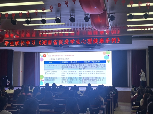 会上,田琼老师以“以法为盾,用心护航”为开篇,带领家长系统学习《湖南省促进学生心理健康条例》。她重点解读条例中家长“七大任务、一项禁止、一项特殊要求”的法定职责,用“每周15分钟专属陪伴”“情绪红绿灯暗号”等通俗易操作的建议,将法律条款转化为日常家庭教育的具体方法,明确“打孩子不再是家务事”,强调家庭作为心理健康“第一防线”的重要责任,尤其提醒留守儿童家长需落实“每周联系、每年陪伴”的义务。