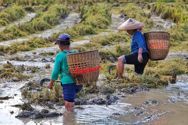 10月上旬,走进高塘村百亩高山优质稻基地,乡间田野遍地金黄,稻浪翻滚,“轰隆、轰隆、轰隆……”的机器声响彻田坝,一台台水稻收割机在田里来回穿梭,奏响了秋日丰收的 “交响曲”。所到之处,一排排稻穗被整齐地卷入机器腹中,完成切割、脱粒、分离等一连串工序。一眨眼功夫,金灿灿的谷粒便通过卸粮筒装入袋中,粉碎后的稻穗秸秆则被均匀地抛洒还田。在收割机难以到达的田埂边缘、陡坡地块,十余名村民组成的人工收割队正忙碌不停,左手握住稻秆,右手挥起镰刀,“唰唰” 声中,一片片水稻应声倒地,整齐地铺在田间。