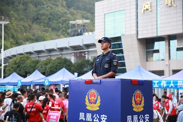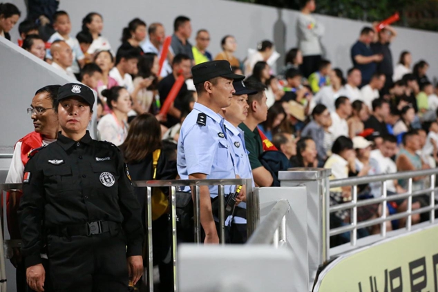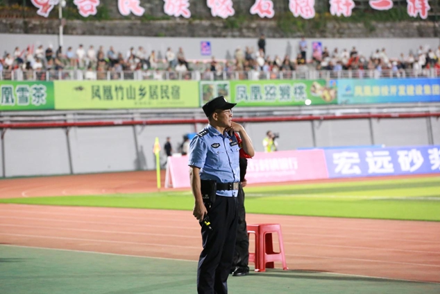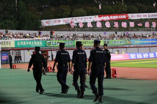 凤凰新闻网10月6日讯(通讯员 郭珊珊 田叶)10月4日晚上,凤凰县民族体育运动中心的球场上人声鼎沸,“湘超”湘西站第三场湘西队对阵长沙队的比赛激战正酣,几千名球迷挥舞旗帜、呐喊助威,用热情点燃了城市的夜空。在涌动的人潮中,一抹抹“藏蓝”身影始终坚守在各自的岗位上,成为这场足球盛宴中别样而动人的风景。
