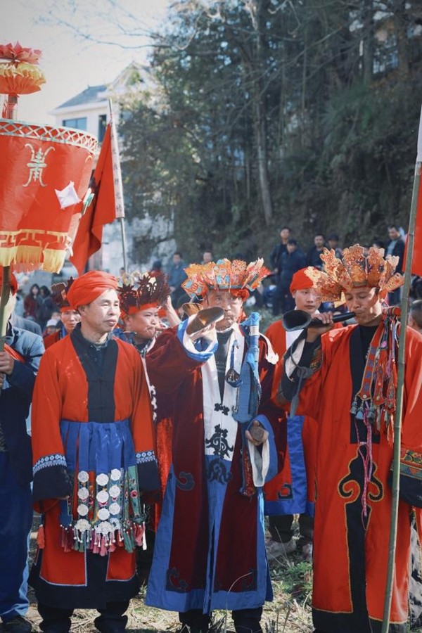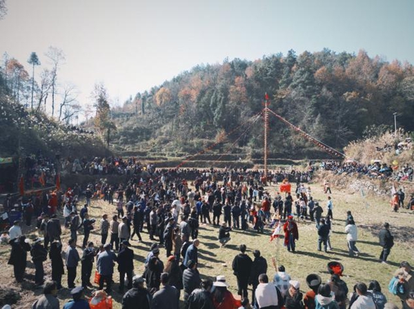 凤凰新闻网12月1日讯(通讯员 龙玉琴)11月29日,苗族巴代迁街度发仪式在凤凰县山江镇古塘村举行。活动现场,旌旗招展,人声鼎沸,约3000名来自周边村落的少数民族同胞齐聚于此,共同见证这场融合还傩愿、上刀山、踩铁犁等传统环节的苗族民俗盛典。